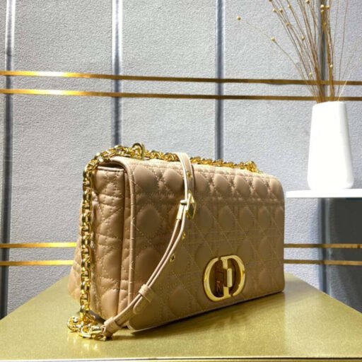 The new Dior Caro handbag is decorated with Cannage pattern stitching on gray calfskin, showing a unique stitch texture. The flap of this soft bag is equipped with a retro gold-toned metal rotating “CD” lock. The design is inspired by the unique closure of the Christian Dior perfume bottle. The detachable iconic “CD” link shoulder strap can be replaced with a wide embroidered shoulder strap, allowing you to create an elegant and fashionable look regardless of occasion, morning or evening.